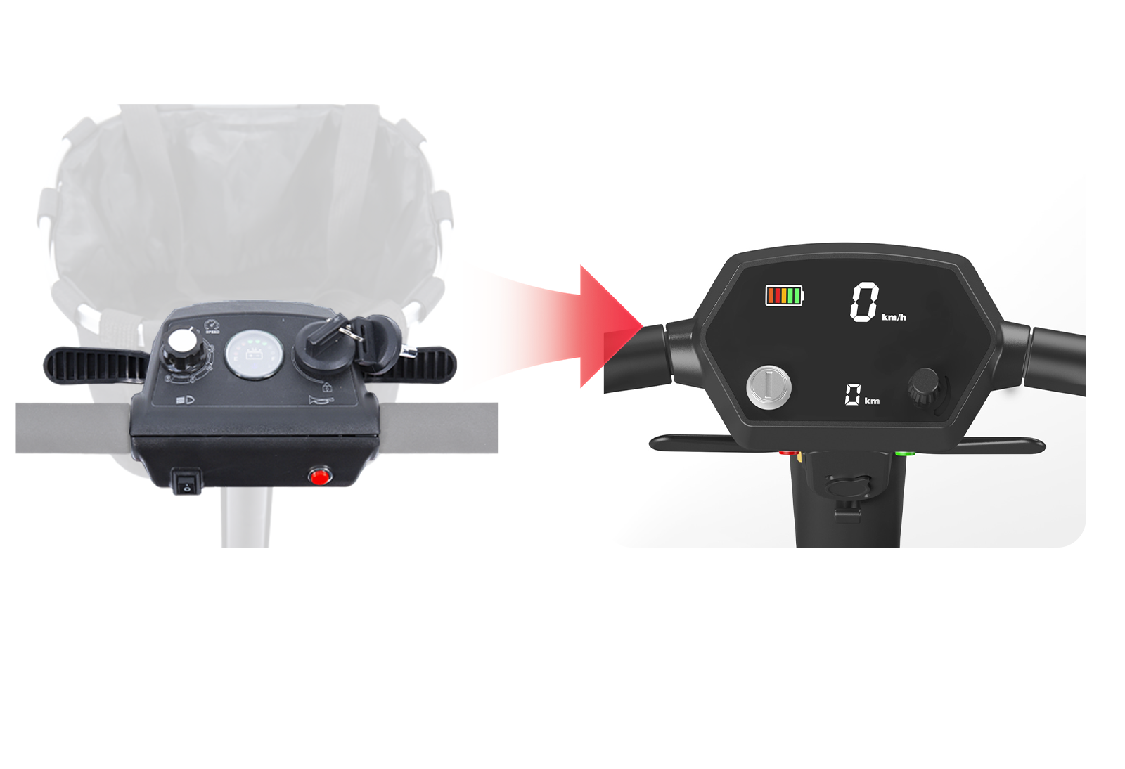 Các đèn báo tốc độ và pin analog nguyên bản không thân thiện với người dùng đối với người dùng lớn tuổi có thị lực kém. Phiên bản nâng cấp có màn hình kỹ thuật số LED độ phân giải cao**, hiển thị chính xác tốc độ hiện tại, lượng pin còn lại và chế độ lái xe theo thời gian thực. Mức pin được biểu thị rõ ràng bằng ba màu: xanh lá cây, vàng và đỏ, cung cấp lời nhắc trực quan để sạc khi pin yếu. Màn hình hiển thị tốc độ chính xác đến 0,1 km/h và với núm điều chỉnh tốc độ (có thể điều chỉnh từ 2 đến 8 km/h), người dùng có thể kiểm soát nhịp lái xe của mình chính xác hơn, tránh cảm giác khó chịu khi thay đổi tốc độ.